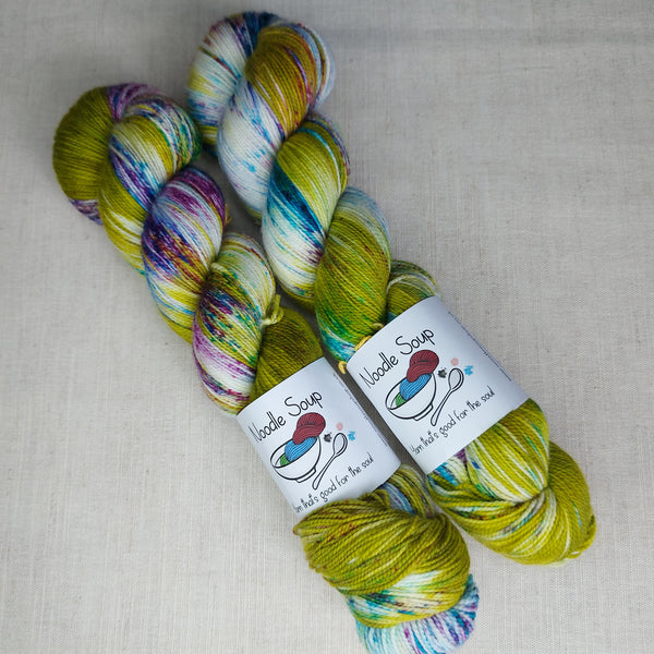 This fresh and bright colourway was an absolute joy to dye up. A firework display of speckles in greeny blue, rich plum and gold against splashes of olive green and gunmetal grey.